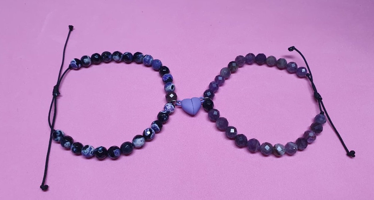 La conexión que se siente. Este set de dos pulseras une la serenidad de la Amatista y el equilibrio del Ágata Morada con un corazón magnético que se une al estar cerca. El símbolo perfecto de unión y amor para llevar siempre contigo.