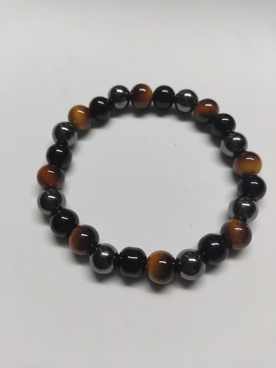 Poder total en tu muñeca. Esta pulsera combina tres de las piedras de protección más fuertes: Ojo de Tigre, Hematite y Obsidiana. Un escudo completo diseñado para brindarte seguridad, enfoque y éxito en cada paso.